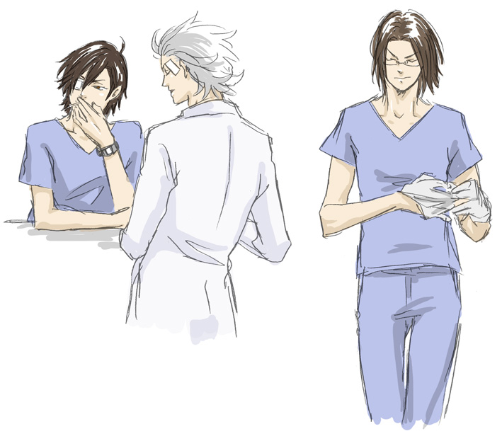 看護師チームは賑やかそうですよね。入院してても寂しくなさそう。上で書いた妄想のように権力争いも萌えますが、拍手絵のように普通にほのぼの病院をやってるのもいいと思います。いつも通ってる患者さんとかと、家族みたいにキャッキャしてる看護師や医師を妄想すると顔がにやけてきそうですよ。